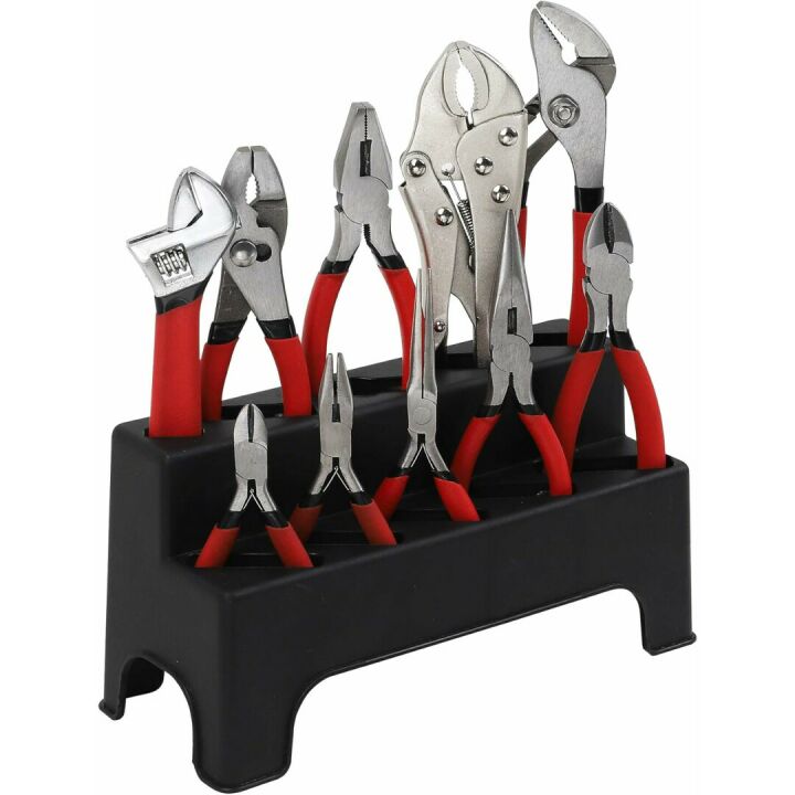 This 10-piece toolset includes a combination of pliers and wrenches, providing the essential tools needed for numerous tasks. Each piece is crafted from durable metal that ensures longevity and effective performance. The handles are designed for comfort and grip, featuring rubber moldings that enhance control and prevent slippage. The set also comes with a handy rack for organized storage.