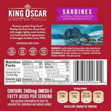 Unlike many conventional canned sardines, King Oscar’s Mediterranean One-Layer Sardines stand out in terms of flavor and quality. Competitors often offer canned fish with strong smells and bland tastes, but King Oscar's meticulous preparation showcases the suitable balance of brininess and seasoning. Customers appreciate the subtle aroma and rich flavor profile that these sardines provide, standing as a testament to their exceptional production standards. This product is ideal for those who value quality and taste without the overwhelming fishiness often associated with canned seafood.