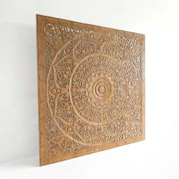 Show moreTransform your bedroom into a stunning sanctuary with the King Size Wood Mandala Headboard, an exquisitely crafted decorative centerpiece made from reclaimed teak wood. This exceptional headboard measures a generous 76 inches wide and tall, fitting seamlessly above your bed while adding a touch of rustic elegance to your space. Its unique design features four meticulously crafted panels, each 19 inches wide, creating an eye-catching mandala pattern that is sure to be a conversation starter. Embrace the natural beauty of teak and elevate your bedroom aesthetic with this stylish and functional piece.