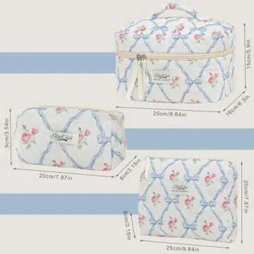 kingkiss 3PCS Quilted Floral Makeup Bag, Large Capacity Travel Cosmetic Bag, Cute Floral Makeup Bag Makeup Travel Organizer, for Women Girls (Blue)