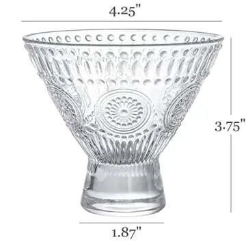 The exquisite embossed pattern on the exterior adds a touch of timeless charm to these glasses, making them a stylish addition to any table setting. Measuring 4.25 inches in width and 3.75 inches in height, they fit comfortably in hand while also providing a large surface area that enhances the aroma and flavor of the drink. Whether you're hosting a sophisticated cocktail party or simply enjoying a drink at home, these glasses promise to elevate your experience.