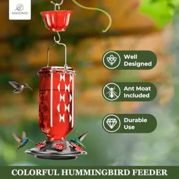 Kingsyard Glass Hummingbird Feeder for Outdoor Hanging, 24 Ounces, 6 Feeding Ports, Bird Nectar Feeder for Garden Décor, Ant Moat Included, Red