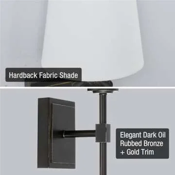 Show moreIf you're looking to elevate your living space or bathroom with a touch of elegance, this beautiful wall sconce is your perfect solution. It features a stunning mid-century modern design that draws the eye and creates a captivating ambiance. The wall sconce showcases a sophisticated oil-rubbed bronze finish paired with a superior white conic fabric hardback linen shade, making it a stylish addition to contemporary and traditional interiors alike. With a slender body and long detailed stem, this fixture is not just a source of light, but an artistic statement piece that can transform the atmosphere of any room.