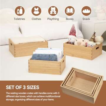 Show more Introducing the stunning set of three wooden nesting organizer baskets, a perfect blend of durability and stylish design. Crafted with precision using high-quality materials, these crates are not just functional, but also elevate the aesthetic of your home decor. Each box features handle holes that allow for easy lifting and moving, making them incredibly convenient to use. The mortise and tenon joint construction adds to their stability and visual appeal, making them a beautiful addition to any space.