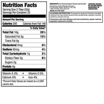 Show moreIndulge in the delightful taste and creamy texture of Kirkland Organic Creamy Peanut Butter, meticulously crafted from premium U.S. Valencia peanuts. Each jar in this convenient 2-pack contains 28 ounces of pure peanut butter bliss, where nature’s flavor is enhanced with a sprinkle of sea salt and dry roasting to elevate your culinary experience. Perfect for spreading on toast, blending into smoothies, or simply enjoying right from the spoon, this organic peanut butter is a must-have for every peanut butter lover!