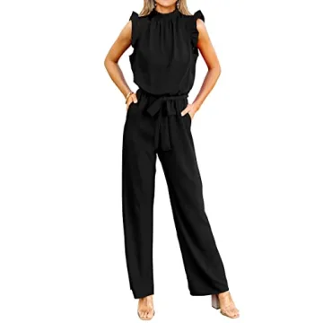 The jumpsuit features a high waist with a belt, flattering ruffles on the sleeves and neckline, and practical pockets that blend functionality with style. The mock neck and loose fit provide comfort without sacrificing sophistication, while the tie closure at the back adds a touch of allure to this already fabulous outfit. Plus, its elegant silhouette is complemented by wide-leg pants, allowing ease of movement.