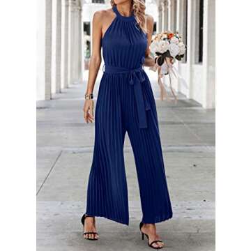 Show more Step into summer with unparalleled elegance in the KIRUNDO Women 2024 Summer Halter Neck Sleeveless Pleated High Waist Belted Dressy Wide Leg Pant One Piece Jumpsuits Romper. Crafted with attention to detail, this stunning navy jumpsuit is designed to flatter every silhouette. Its halter neck design brings a touch of sophistication, while the sleeveless cut ensures comfort during those warm summer days. The pleated high waist creates a stunning hourglass figure, offering the perfect balance of style and a chic, relaxed fit.