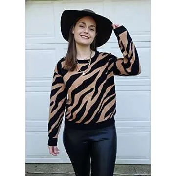KIRUNDO Women's 2023 Fall Winter Casual Long Sleeve Crew Neck Zebra Striped Print Color Block Knit Sweater Pullover Tops(Zebra-Yellowish Brown, Medium)