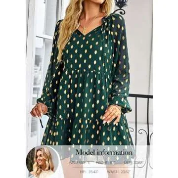 KIRUNDO Women's 2024 Fall Long Sleeve Gold Polka Dot Cute Babydoll Dress Casual V Neck Loose Tiered Flowy Mini Dress(Dark Green, X-Large)