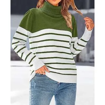 Show more Elevate your fall and winter wardrobe with the KIRUNDO Women's 2024 Fall Winter Turtleneck Knitted Sweater, a perfect blend of functionality and fashion. This cozy turtleneck features a stylish striped color block design, ideal for adding a touch of modernity to your ensemble. Made from soft, breathable materials, this pullover top offers unmatched comfort while keeping you warm on chilly days. Its long sleeves and ribbed texture not only enhance the fit but also add an element of sophistication, making it a versatile choice for various occasions.