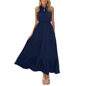 Show more Step into the summer season with the elegant KIRUNDO Women's 2024 Summer Casual Sleeveless Maxi Dress. This stunning navy blue sundress is designed to blend comfort and style seamlessly, making it your go-to choice for a variety of occasions. The dress features a beautiful tie crew neck, enhancing its chic, feminine silhouette. With an A-line design that flatters every body type, the dress flows effortlessly, while ruffles add a touch of playfulness to your summer wardrobe. Whether you're heading out for a sunny brunch or a relaxed evening stroll, this dress promises to keep you feeling confident and stylish.