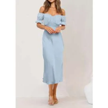 KIRUNDO Women's 2024 Summer Satin Midi Dress Off Shoulder Wrap Ruched Wedding Guest Party Cocktail Formal Prom Dresses(Light Blue, Small)