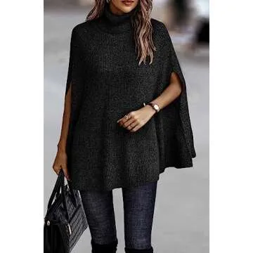 KIRUNDO Women's 2025 Fall Winter Turtleneck Poncho Sweater Fashion Chunky Knit Cape Wrap Sweaters Pullover Jumper Tops(Black, Small)