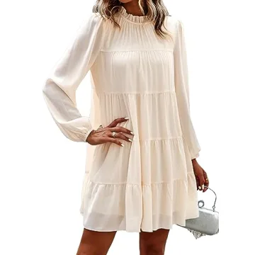 Show more Introducing the KIRUNDO Women's 2025 Spring Long Sleeve Ruffle Mock Neck Tiered Mini Babydoll Dress, the ultimate fusion of comfort and style designed for the modern woman. Perfectly suited for various occasions, this casual summer flowy swing tunic shift dress is available in a refreshing apricot color that embodies the vibrant essence of spring, making it a delightful addition to your wardrobe. Experience unparalleled comfort due to its breathable material and loose-fitting silhouette, ensuring you can enjoy every moment, whether you're out for brunch or dancing the night away.