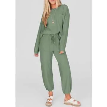 KIRUNDO Women's Spring 2 Piece Outfits Ribbed Knit Lounge Sets Long Sleeve Pullover Drawstring Jogger Pants Tracksuit Set(Bean Green, Medium)