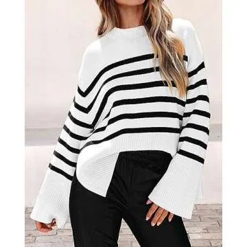 KIRUNDO Women's Striped Knit Oversized Fall Sweaters 2025 Trendy Clothes Crewneck Winter Pullover Sweater Side Split(White, Medium)