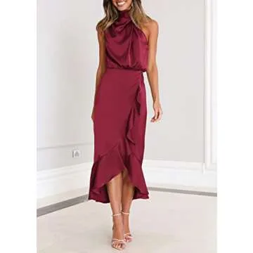 ... Show more Introducing the stunning Women's Mock Neck Satin Midi Dress, a masterpiece crafted from soft, lightweight satin material. This elegant dress drapes beautifully, ensuring comfort and style whether you're attending a wedding or a cocktail party. The asymmetrical frills on the neckline add a unique touch of sophistication, making this piece stand out in any gathering. Designed with a sexy wrap bodycon silhouette, the ruffles and elastic waist highlight your graceful figure while allowing freedom of movement.
