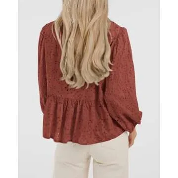 Show moreIntroducing the KIRUNDO Women's Tops Casual Dressy Tie Front Bow Puff Sleeve Eyelet Peplum Babydoll Cute Shirts, a perfect blend of style and comfort for the modern woman. Each top is crafted from **100% cotton** to ensure lightweight softness, breathability, and a comfortable fit that lasts throughout the day. The delightful **tie front design** features a charming bow and five transparent buttons that not only serve a functional purpose but also add a touch of elegance. With a range of colors including gorgeous **red brown**, this top is designed for versatility, offering a silhouette that flatters all body types and makes it ideal for any occasion.