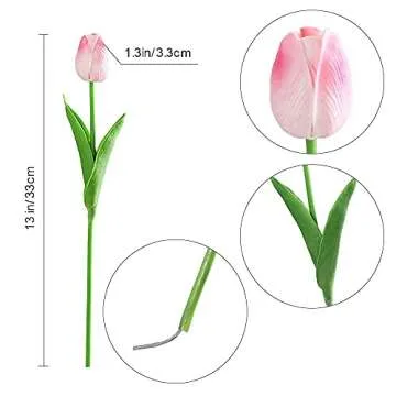 Show more Bring the charm of spring into your home any time of the year with the Kisflower 30Pcs Latex Tulips. These stunning artificial flowers are expertly crafted from premium PU (polyurethane) and feature a sturdy steel wire stem encased in soft plastic, allowing for a remarkable height of 13 inches (33CM) and a delicate bud size of 1.38 inches (3.5CM). Each set includes 30 lifelike tulips, providing ample blooms to create beautiful arrangements for any occasion. Their authentic colors and non-plastic appearance make them a standout choice for decorating your space without compromising on quality.