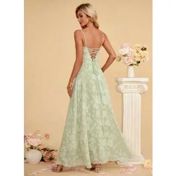 Kismissal Women's Elegant Wedding Guest Dress Spaghetti Straps Floral Sleeveless Formal Dress Maxi Evening Party Dress Green