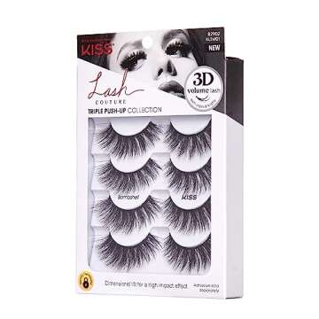 Show more Elevate your beauty routine with the exquisite 3D Strip Lashes by KISS. Designed with inspiration from the iconic push-up bra, these lashes deliver significant volume, defining length, and an eye-lifting curl that will make your eyes pop. Each pair features a soft plush texture and a unique, multi-layered design for a stunning 3D effect. The lashes not only add dramatic flair but also offer a natural look that enhances your overall appearance.