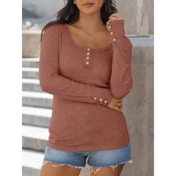 Kissfix Womens Long Sleeve Shirts Going Out Fall Clothes Casual Henley Tops Ribbed Knit Blouses Fashion Trendy Outfits Maroon S
