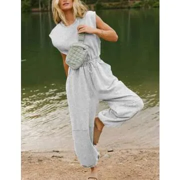 Kissonic Women Casual Jumpsuit Summer Sleeveless Drawstring Romper Cute One Piece Outfits Workout Lounge Jumpsuits with Pockets(LightGrey-M)