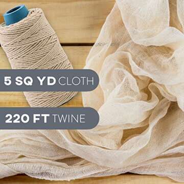 Kitchen Gizmo Cheesecloth and Cooking Twine - Grade 50 100% Unbleached Cotton Stainer | 5 Yards/45 Sq. Feet Cheese Cloth for Straining with 220ft. Butcher Twine, Food Grade Bulk Homesteading Supplies