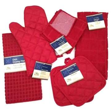 Show more Discover the perfect addition to your kitchen with our vibrant and functional set featuring two wash rags, one dish towel, one oven mitt, one drying pad, and two pot holders. This thoughtfully curated set is designed for those who appreciate both aesthetics and practicality, making cooking and cleaning a delightful experience.