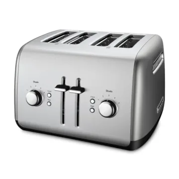 Show moreElevate your breakfast experience with the KitchenAid 4-Slice Toaster with Manual High-Lift Lever - KMT4115 in an elegant Contour Silver finish. Designed with versatility and style in mind, this toaster features four extra-wide slots, allowing you to toast a variety of breads, from bagels to thick artisanal loaves, all at the same time. With dual independent controls, you can cater to different preferences without any hassle. The toaster’s innovative heating element, specifically designed for bagels, reduces heat on one side by 50%, ensuring the outer layer browns perfectly while the inside remains warm and soft. You’ll appreciate the adjustable shade control with five settings, letting you achieve your desired toast shade from light to dark effortlessly.