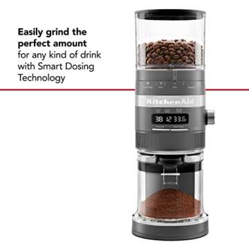 Introducing the KitchenAid Burr Coffee Grinder, a must-have for coffee lovers who appreciate the finer nuances of a perfect brew. With its elegant matte charcoal grey finish, this grinder combines style and functionality to elevate your coffee experience. Each grind is optimized with Smart Dosing Technology, allowing you to effortlessly achieve the ideal amount and consistency for every drink selection. The ease of use, coupled with KitchenAid's renowned quality, makes this grinder a standout...