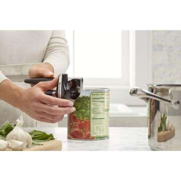 Show moreThe KitchenAid Can Opener in classic black is your ultimate kitchen companion designed to easily handle any can, from soup to vegetables. Made with a strong stainless steel blade, this can opener ensures a reliable and effortless opening experience for all types of cans. Its oversized, easy-to-grip turn knob allows you to open cans with minimal effort, making it perfect for users of all ages and hand sizes. Unlike traditional can openers that can be cumbersome or require excessive strength, the KitchenAid design features ergonomic handles which provide a comfortable grip that fits perfectly in your hand, allowing for a smooth and controlled operation.