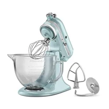 Show moreTransform your culinary journey with the KitchenAid KSM155GBAZ 5-Qt. Artisan Design Series Mixer, a visually stunning and performance-driven appliance that transforms cooking and baking into an art form. Crafted with a striking Azure Blue finish, this mixer isn’t just a kitchen tool—it’s a statement piece. The versatile 5-quart glass bowl with measurement markings allows for precision mixing, while the multipurpose attachment hub opens up a world of possibilities by accommodating over 15 attachments, so you can mix, whip, and knead with ease. With 10-speed settings, you control the mixing intensity, ensuring the perfect outcome for every recipe, from delicate whipped cream to robust dough.