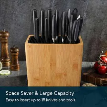 Show more The KITCHENDAO XL Bamboo Universal Knife Block is the ultimate solution for knife organization in any kitchen. Crafted from natural bamboo, this elegant and functional knife holder can accommodate any knife up to 8.6 inches, regardless of the blade shape, making it a versatile addition to your culinary tools. No more confusion trying to find the right slot for each knife; this universal design offers a seamless storage experience. The double-deck system securely holds your knives while maintaining space efficiency on your countertop.