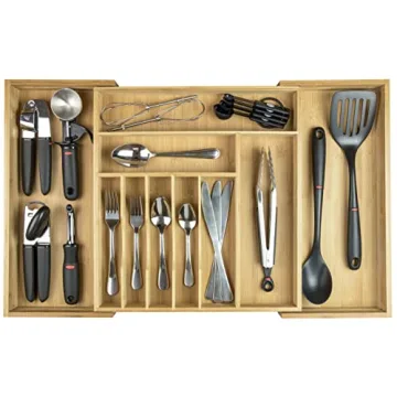 Show more Introducing the KitchenEdge Premium Silverware, Flatware and Utensil Organizer—a game-changer for your kitchen organization needs! This elegantly designed organizer is not only aesthetically pleasing, crafted from 100% natural bamboo, but it also offers **unmatched functionality** with dimensions of 17.4" deep, 2.7" tall, and an expandable width ranging from 16" to 28". With its patented design, you can effortlessly arrange up to a complete 12-piece flatware set across six thoughtfully crafted compartments, allowing for optimal separation of all your utensils—from large forks, small forks, to knives and serving spoons. You'll truly appreciate how this organizer can fit perfectly in your drawer, making it look custom-made for your space!