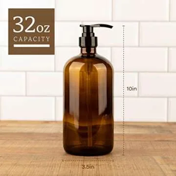 kitchentoolz 32 Ounce Glass Pump Dispenser Bottle, Large Amber Container with Pump for Shower and Bath Shampoo Soap Conditioner Lotion - 1 Liter