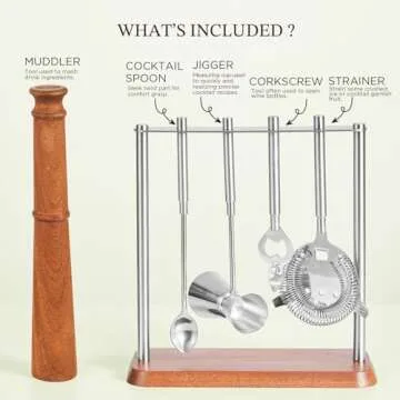 stylish set are a muddler, jigger, bar spoon, bottle opener, and