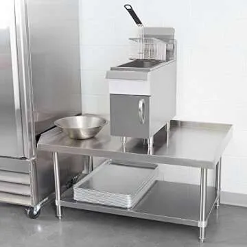 Show more This high-quality stainless steel equipment stand is the perfect addition to any commercial kitchen. Designed to support heavy equipment, it features a durable stainless steel top capable of holding up to 900 lbs of evenly distributed weight, making it ideal for holding mixers, slicers, beverage dispensers, and more. As an NSF-approved product, it meets stringent public health standards, guaranteeing safety and reliability for your food service needs.