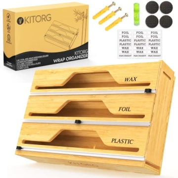 Show more Transform your kitchen organization with the **KitOrg Bamboo Foil and Plastic Wrap Organizer**, crafted from durable, multi-layered strong Moso Bamboo. This versatile organizer is a must-have for anyone looking to streamline their kitchen storage. It cleverly accommodates various wraps including aluminum foil, plastic wrap, and parchment paper. No more messy drawers filled with tangled rolls – this genius product can be conveniently placed in your kitchen drawer, mounted on a wall, or kept on the countertop, combining functionality with a sleek, natural aesthetic.
