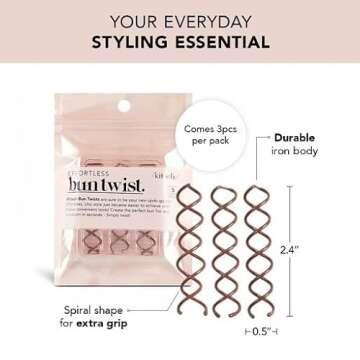 Show moreIntroducing the Kitsch Spin Pins for Hair Styling and Buns, a revolutionary solution for effortless elegance. Expertly crafted from durable iron, these spiral bob pins redefine your hair styling experience with their unique corkscrew design. Designed to create complex updos and chic messy buns without the fuss of traditional hair ties or bobby pins, these hair accessories empower you to express your style with simplicity and grace. With each pack containing three stunning rosegold pins, these tools are not only functional but also fashionable, perfect for any occasion.