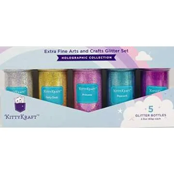 Show more Unleash your creativity with our premium extra fine holographic glitter powder, a must-have for all craft enthusiasts! This dazzling set features five unique colors that add a touch of sparkle to your projects. Each of the five plastic bottles comes filled with 65g of high-quality, non-toxic glitter, totaling a magnificent 325g to fuel your imagination.