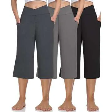 Kivdol 3 Pack Womens Wide Leg Yoga Capris Crossover High Waist Casual Capri Pants Loose Soft Pajama Pockets Sweatpants