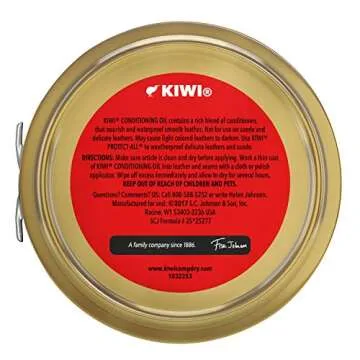 Show moreKIWI Conditioning Oil is your ultimate solution for maintaining and enhancing the beauty of smooth leather. This premium 2.625 oz (1 ct) conditioner ensures that your leather goods remain nourished and waterproofed. Suitable for all colors, this versatile product is perfect for leather boots, shoes, coats, bags, and more. One application revitalizes your leather, protecting it against the elements while restoring its natural luster. Although it may cause light-colored leather to darken slightly, the benefits in protection and appearance are undeniable. From the first application, you’ll notice a significant difference in how your leather looks and feels, making it an essential addition to your leather care regimen.