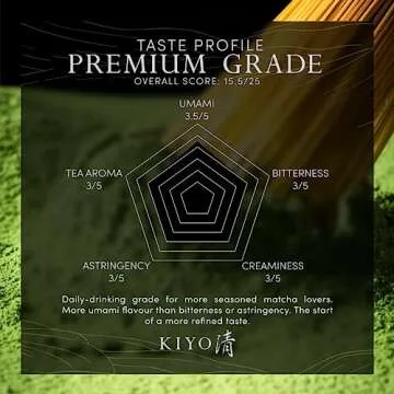 Show more If you're a seasoned matcha lover, look no further than Kiyo Matcha Premium Grade. This exquisite matcha is expertly blended to deliver a robust umami flavor that lacks the bitterness or astringency often associated with lower-grade options. This medium-bodied matcha features a luxurious, smooth, and creamy texture, making it effortless to whisk and savor.