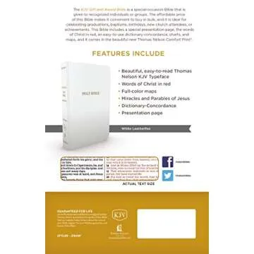When comparing the KJV Holy Bible: Gift and Award Edition with other similar products, it stands out due to its elegant white leather-look cover that appeals aesthetically, and the Comfort Print technology, which enhances legibility significantly. Many competitors may not offer red-letter editions or the same attention to readability, making this Bible not only a functional item but also a beautiful keepsake resonating with quality. The KJV translation's rich history and prestige elevate its status, placing it above many other modern translations.