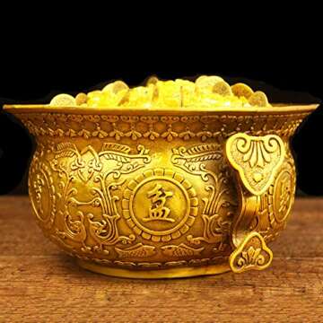 Show moreIntroducing the KKJJ Treasure Bowl Feng Shui Decoration — a captivating piece of art designed to invite prosperity and abundance into your life. Crafted from exquisite pure copper, this treasure basin is not only a stunning decorative item but also a powerful symbol of wealth and fortune. With its radiant brass-gold finish, this treasure bowl serves as an exquisite centerpiece that complements any home or office decor. Measuring at a convenient 10cm, it seamlessly fits into various spaces, making it ideal for both small and large settings.