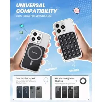 Introducing the **Klearlook Magnetic Suction Phone Mount**, the ultimate accessory for content creators and anyone who enjoys capturing moments effortlessly! Designed with wide compatibility, this mount easily works with MagSafe phones, including the latest iPhone 16/15/14/13/12 series. For those with non-MagSafe phones, the included plastic magnetic ring ensures everyone can enjoy this innovative grip. Featuring a sleek black finish, this product not only enhances functionality but also adds a modern touch...
