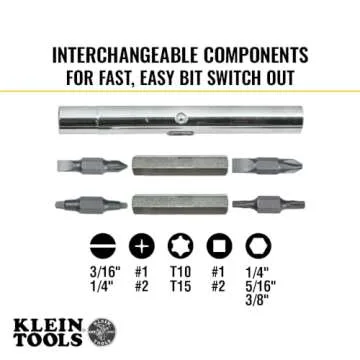 Show moreThe Klein Tools 32500 11-in-1 Screwdriver / Nut Driver Set is the ultimate companion for both DIY enthusiasts and professionals alike. Designed with versatility and efficiency in mind, this multi-bit screwdriver is a game-changer in tool design. With a robust build and innovative features, it combines the functionality of 11 essential tools into a sleek and compact design. The set includes an impressive range of bits—