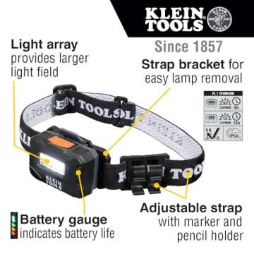 Klein Tools 56049 Rechargeable Headlamp / LED Lights, Adjustable Fabric Strap with Marker / Pencil Holder, 260 Lumens, for Work and Outdoors