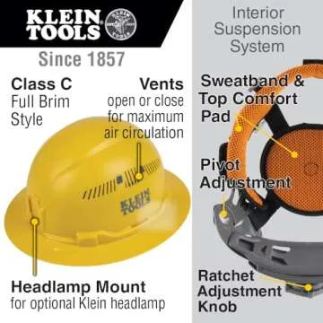 Klein Tools 60262 Hard Hat, Vented, Full Brim Style, Padded Self-Wicking Odor-Resistant Sweatband, Yellow